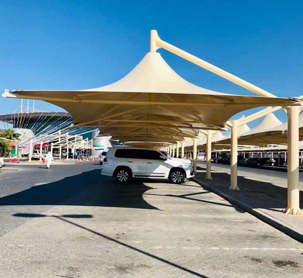 وتُركب هذه المظلات على هياكل حديدية أو ألمنيوم معالجة ضد الصدأ، ما يضمن عمرًا افتراضيًا طويلاً مع صيانة منخفضة.